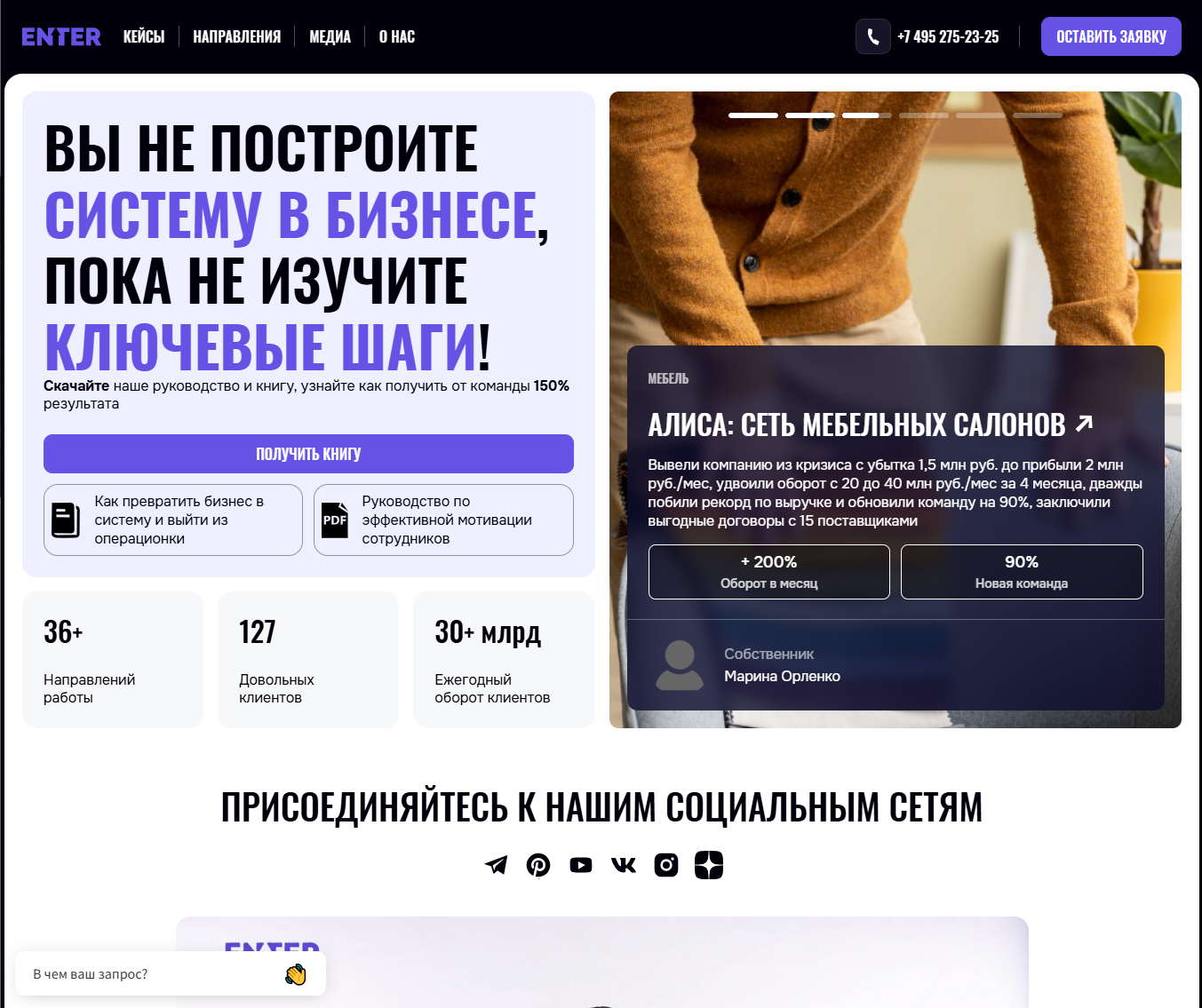 Увеличение эффективности компаний за счет внедрения работоспособных систем регламентаций и общих систематизации. Компания ENTER работает по уникальной технологии собственной разработки, не являющейся копией западной системы, как у подавляющего числа конкурентов